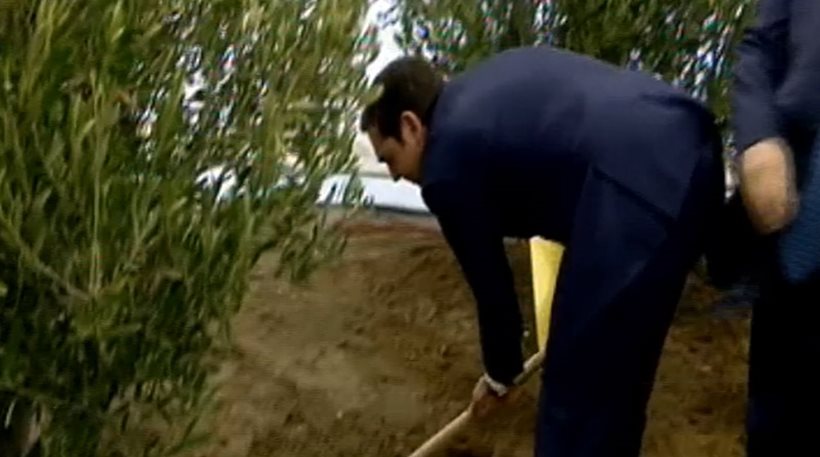 Στη συνέχεια ο Αλέξης Τσίπρας και ο Ρουβέν Ρίβλιν πήραν φτυάρι και έσκαψαν συμβολικά το χώμα προκειμένου να φυτέψουν τις δύο ελιές.