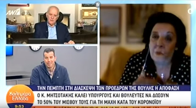 Την ώρα που κυβέρνηση και αντιπολίτευση δηλώνουν πρόθυμες να προχωρήσουν σε μειώσεις μισθών για τη στήριξη του ταμείου του κορωνοϊού, η Λιάνα Κανέλλη, μιλώντας στον ΑΝΤ1, έδωσε μια δική της διάσταση στο θέμα.
